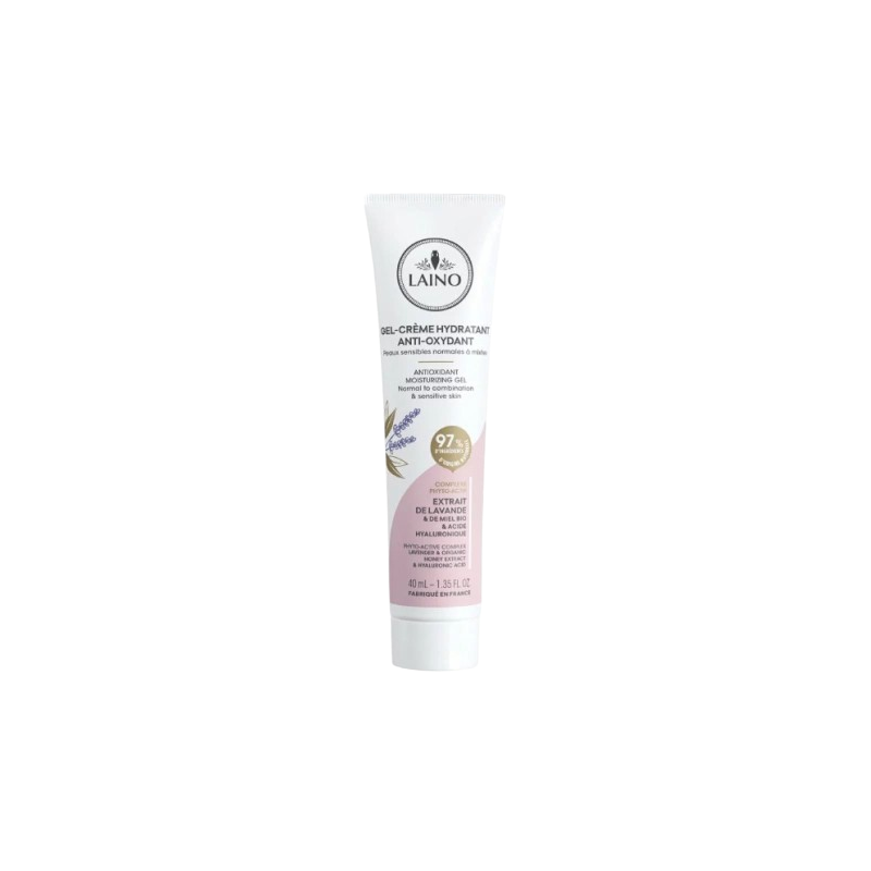 LAINO, Gel Crème Hydratant, Anti-Oxydant, 40ml, peaux mixtes sensibles, réactives, hydratation prolongée, 24 heures, brillances, apaisement, complexe phyto-actif, miel de Provence BIO, extrait de lavande, acide hyaluronique, lanoline végétale, rides atténuées, antioxydants, vieillissement cutané, texture légère, fini mat, teint éclatant, Pharmavie