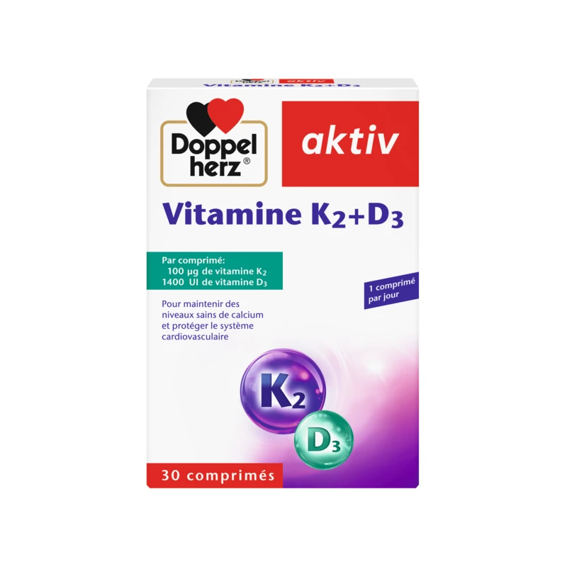 AKTIV VITAMINE K2 + D3 associe deux vitamines essentielles pour le maintien d’une bonne santé osseuse. Chaque comprimé apporte 100 µg de vitamine K2 et 35 µg de vitamine D3 (soit 1400 UI).