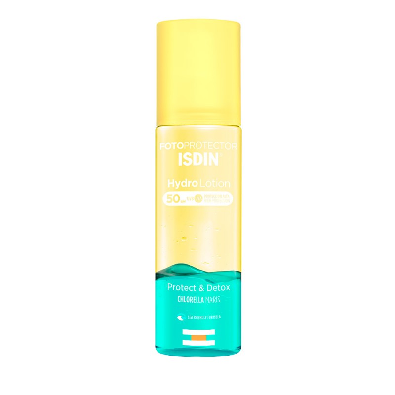 L'Isdin Photoprotector Hydro Lotion SPF50 en format de 200 ml est une protection solaire biphase qui offre une haute protection UVA/UVB tout en détoxifiant